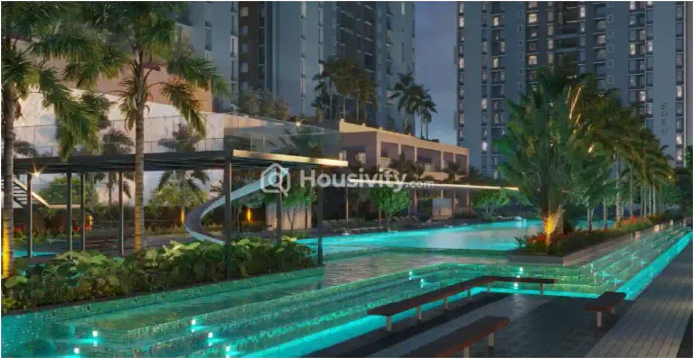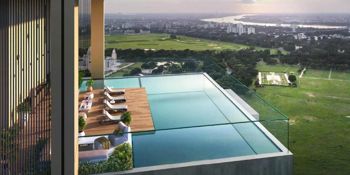 Merlin Azure in New Town is themed around the colour and serenity of azure blue — a water-inspired residential community with blue-tinted water features, azure glass balustrades, and a signature rooftop infinity pool that creates a sky-pool experience. The 2 & 3 BHK apartments at Merlin Azure deliver Merlin Group's quality with a distinctive visual identity that makes this project stand out in the New Town market.